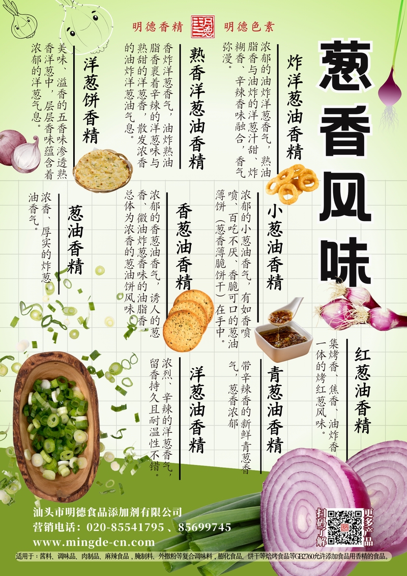 明德蔥香風(fēng)味香精 | 油香蔥韻 覆蓋多場(chǎng)景 汕頭市明德食品添加劑有限公司推出的蔥香風(fēng)味香精系列,涵蓋熟香洋蔥油香精、炸洋蔥油香精、小蔥油香精、香蔥油香精、洋蔥油香精、青蔥油香精、紅蔥油香精、洋蔥餅香精、蔥油香精等多種品類。產(chǎn)品呈現(xiàn)真實(shí)蔥香、洋蔥甜香與炸香特征,留香穩(wěn)定持久,適用于醬料、復(fù)合調(diào)味、肉制品、焙烤以及休閑食品等B端應(yīng)用。